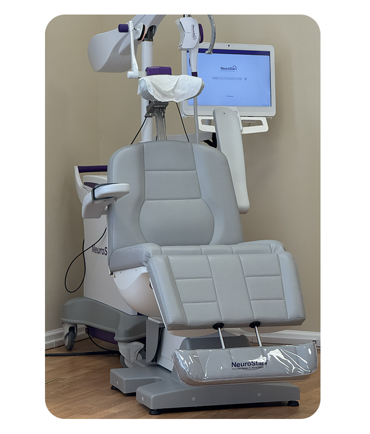 TMS is an FDA-approved, noninvasive treatment for Major Depressive Disorder (including with anxious depression) and Obsessive Compulsive Disorder in patients 15 and older. It works by using focused magnetic pulses similar to an MRI to stimulate specific areas of the brain that regulate mood, motivation, memory, and cognition.